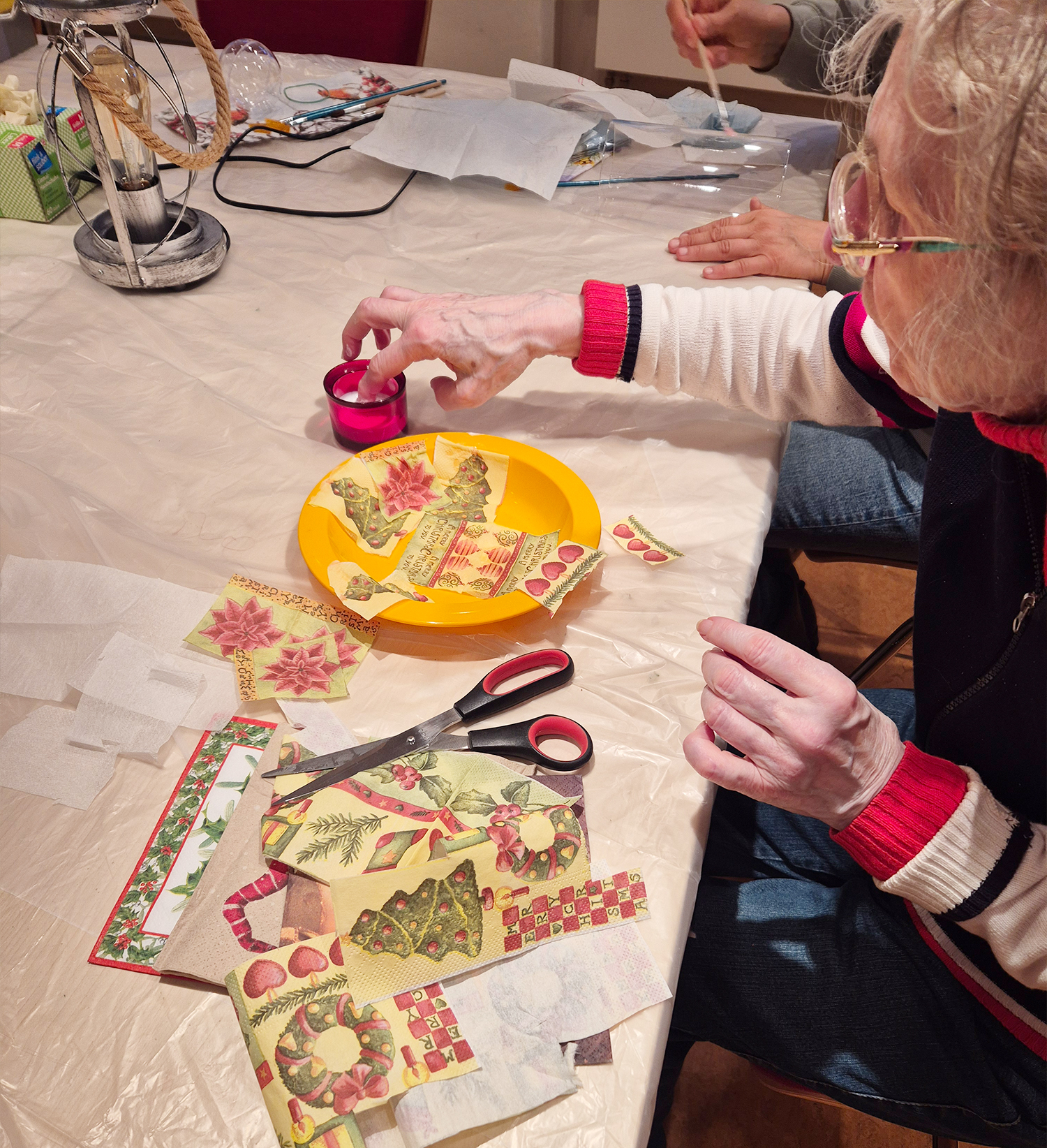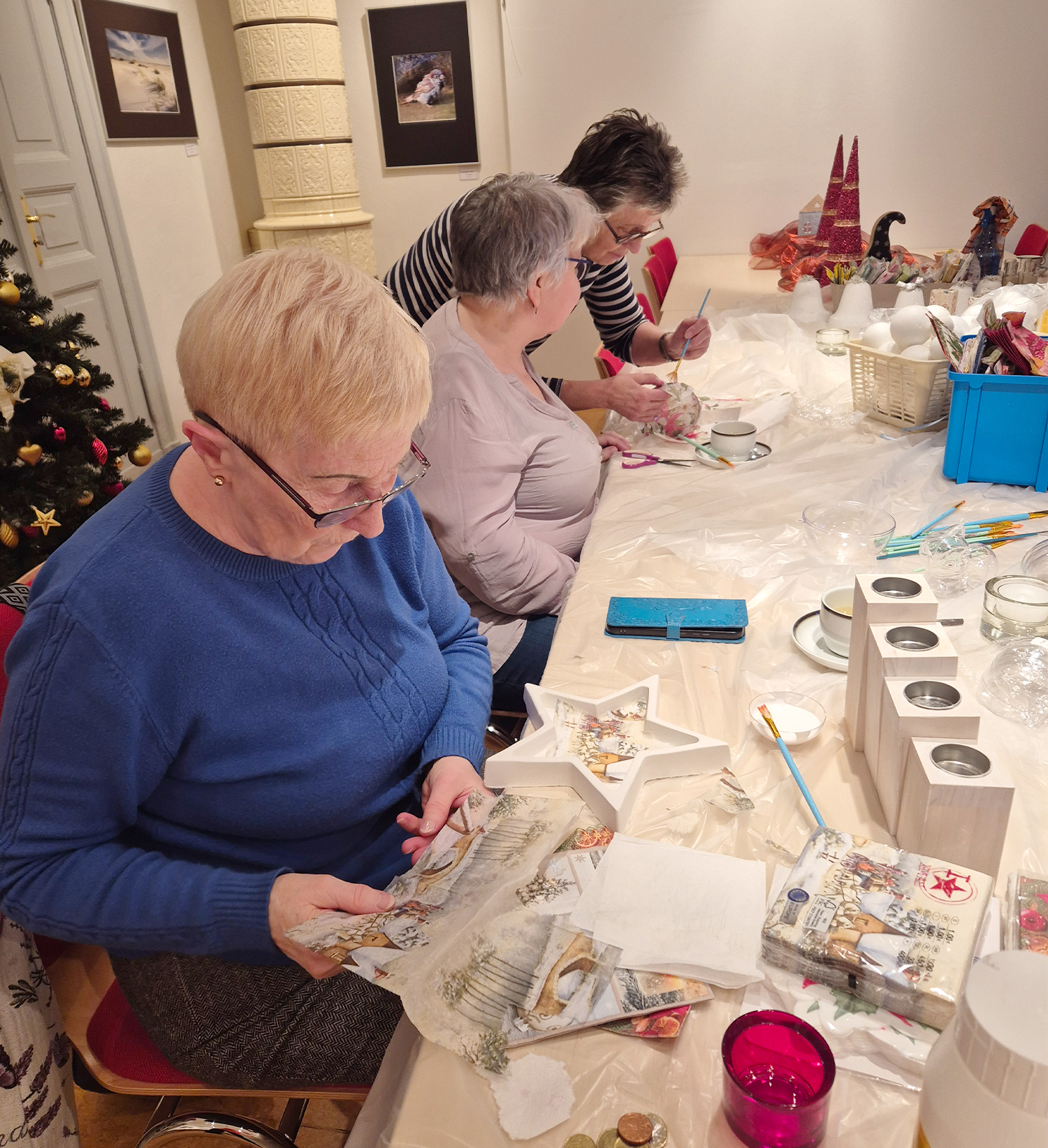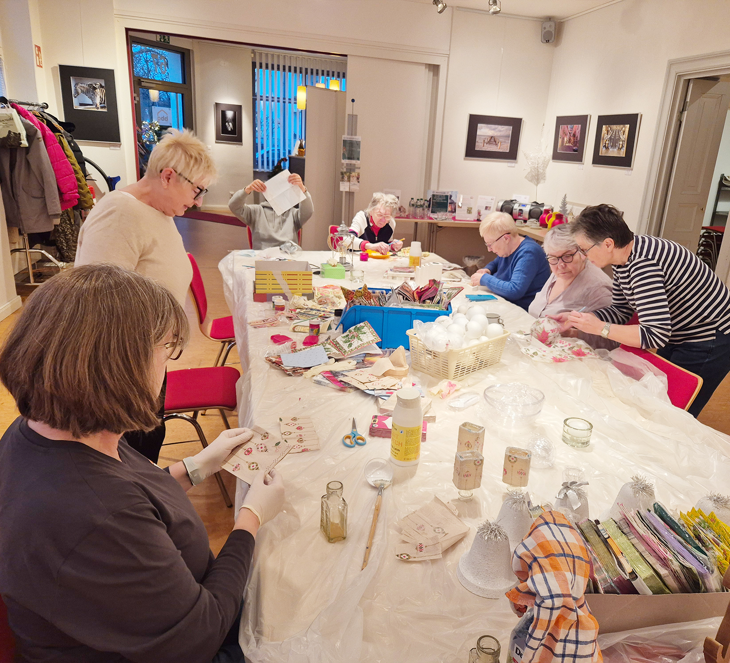 Auf dem Tisch lagen Kugeln, Servietten, Kleber und jede Menge Motive. Einige saßen vertieft über ihrer Kugel, andere kommentierten, was links und rechts entstand. Es wurde geschnitten, geklebt, gelacht und nebenbei viel geredet. Am Ende sah keine Kugel aus wie die andere.
