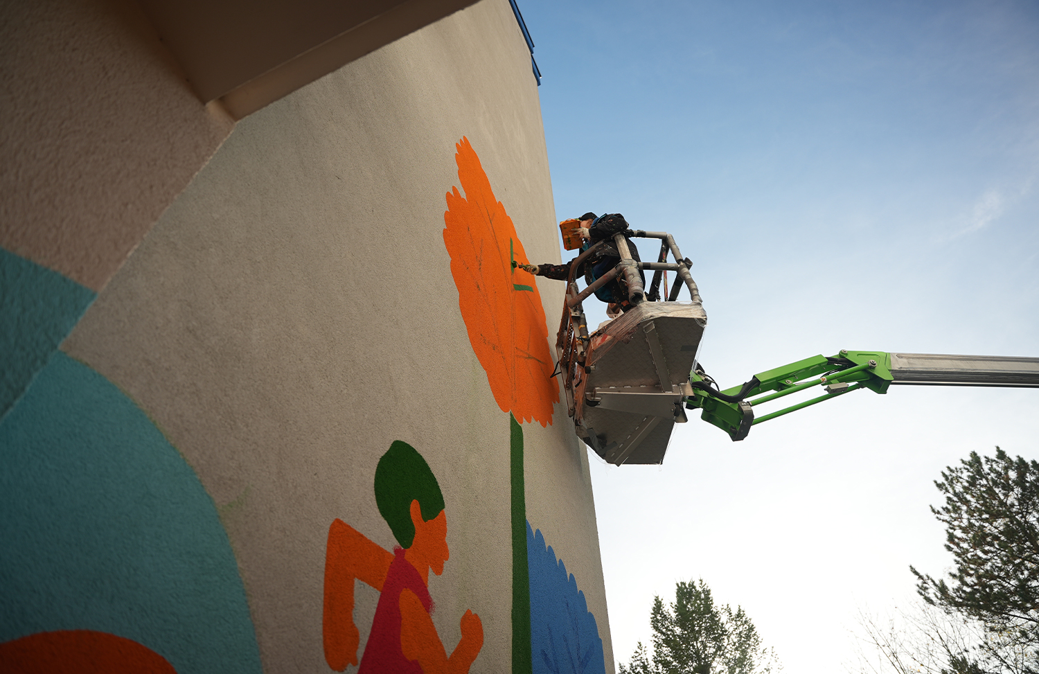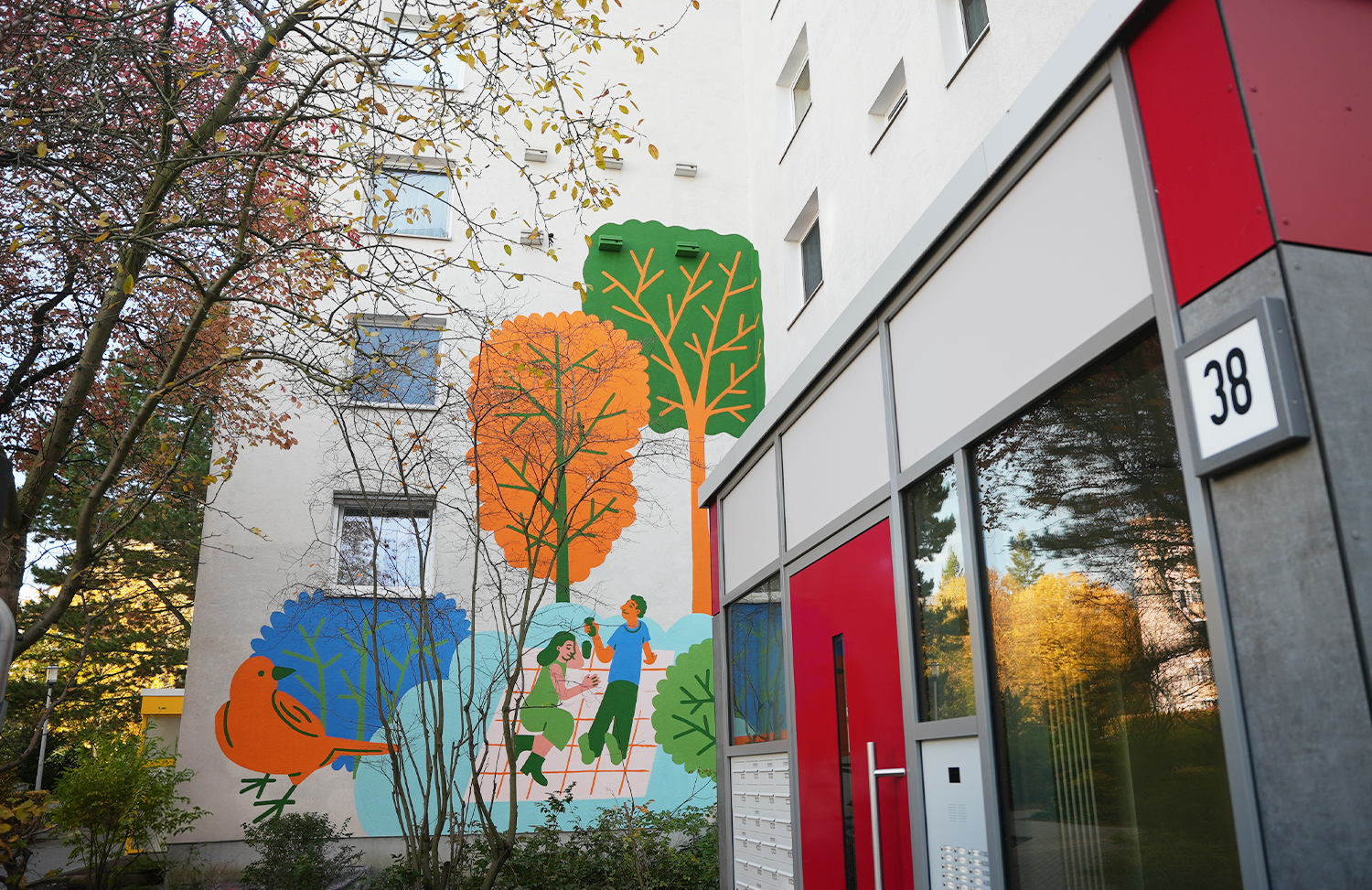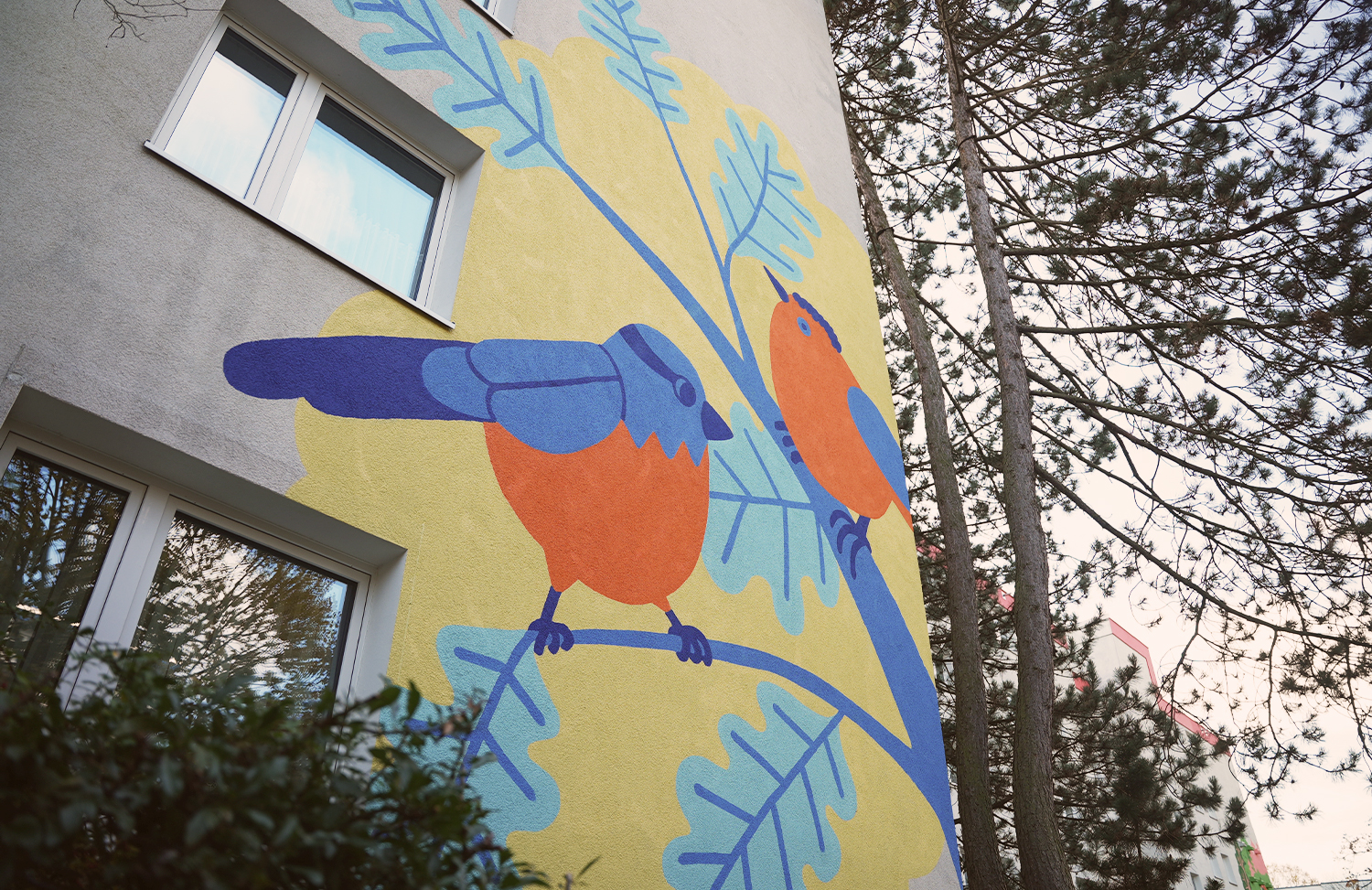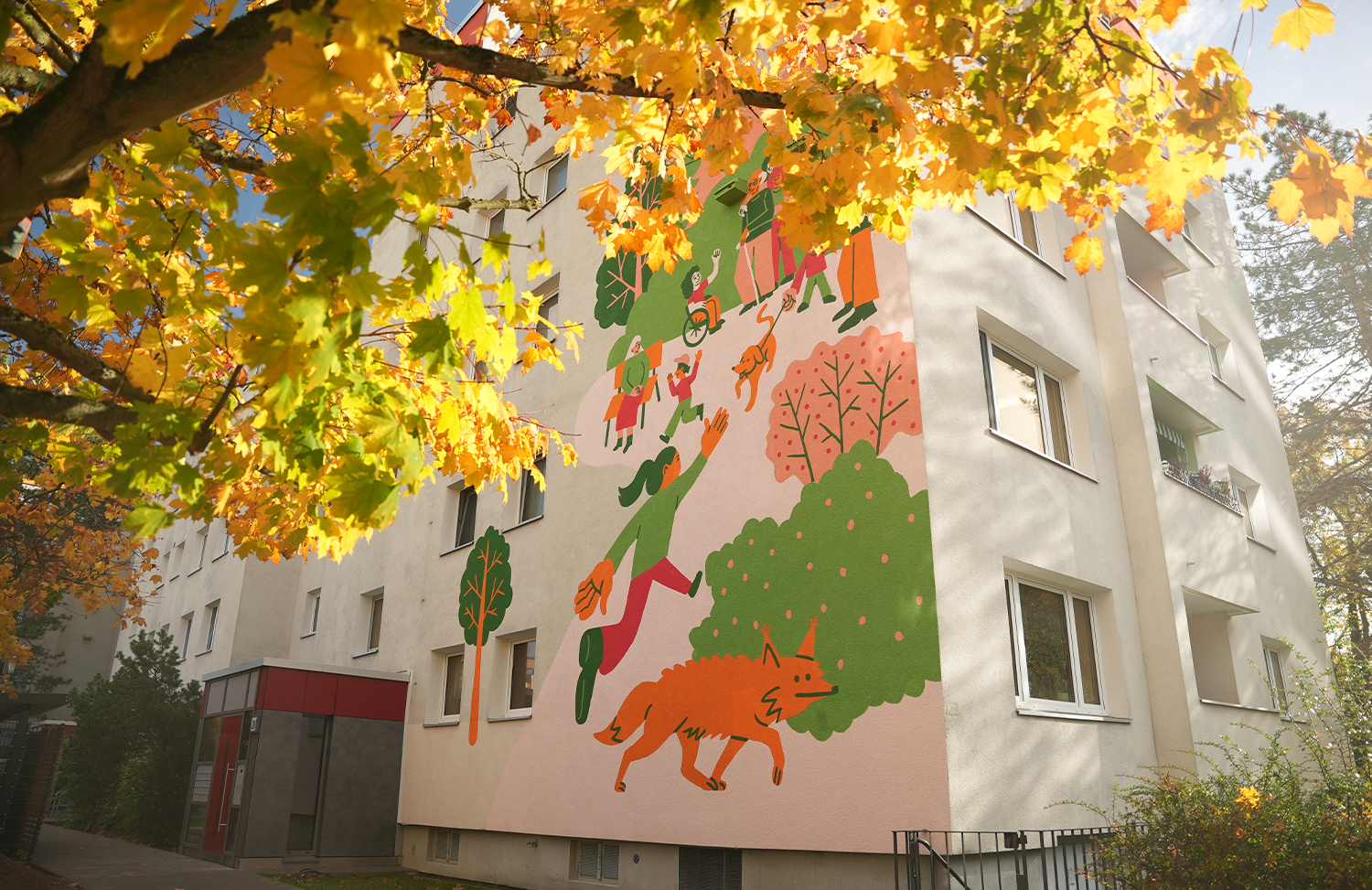 Und zuletzt Wandbemalungen an den Fassaden, die Geschichten der Nachbarschaft und der Natur aufgreifen.